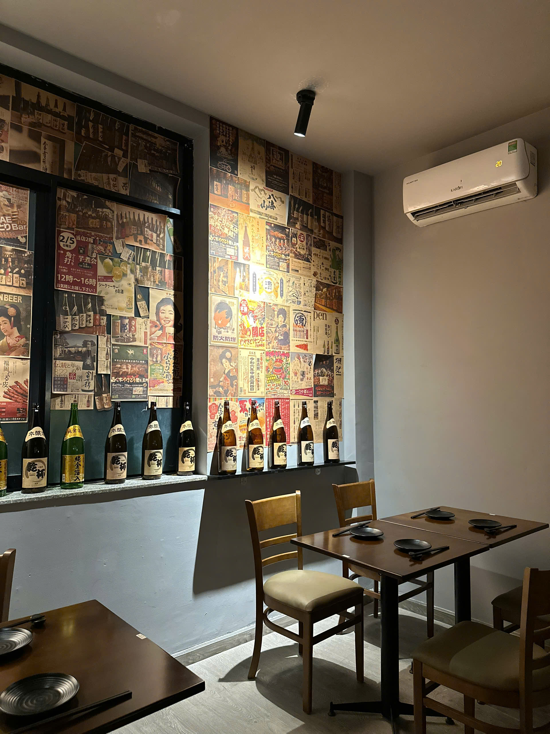 Tường quán được phủ đầy poster Nhật Bản, kết hợp với hàng chai rượu decor tạo nên một background độc đáo và sống động.