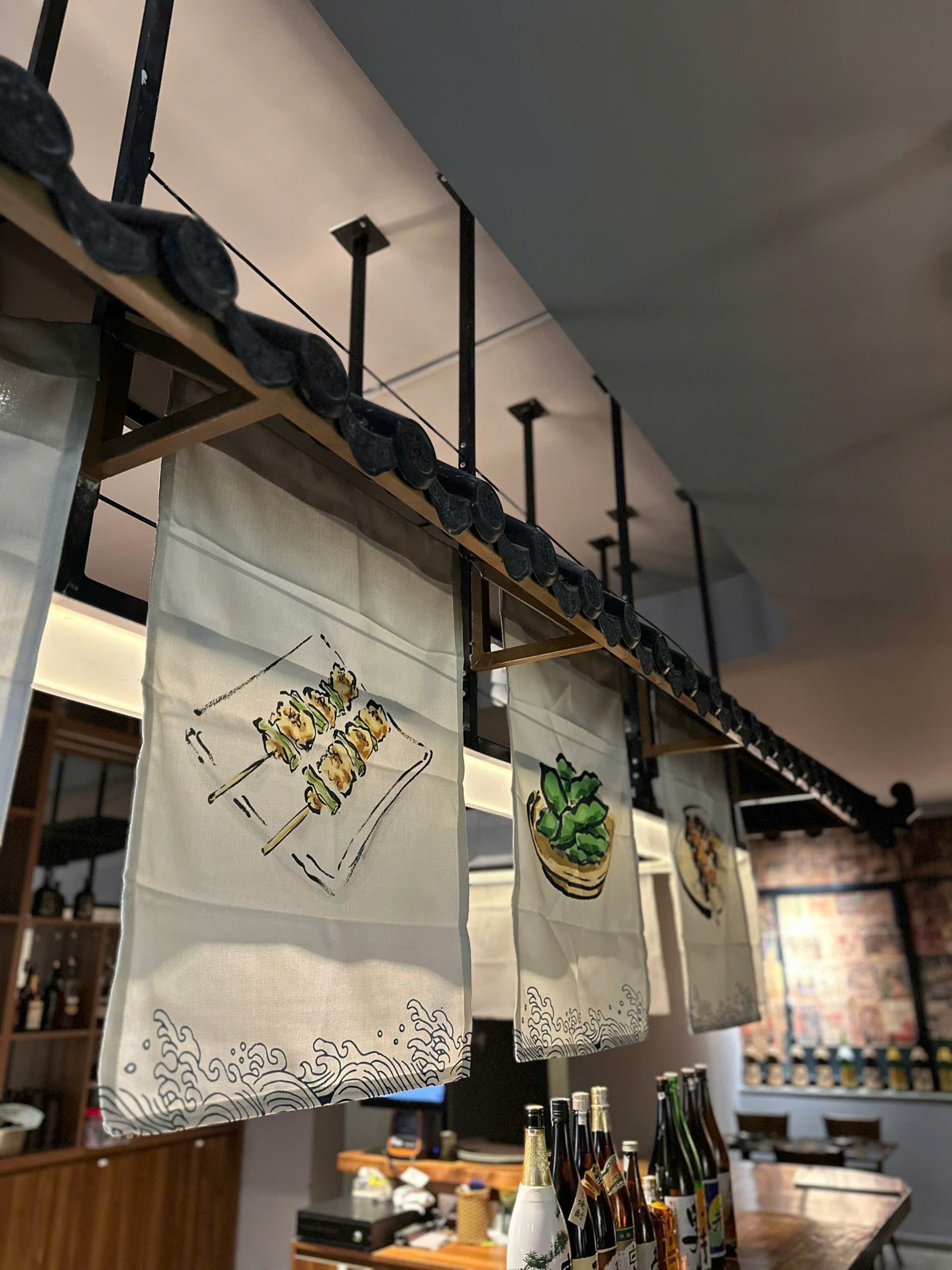 Sử dụng gỗ tự nhiên ốp nan cong, sơn nâu mờ, điểm xuyết bằng rèm noren đặc trưng – quầy bar vừa là điểm nhấn thẩm mỹ, vừa tăng trải nghiệm cho khách.